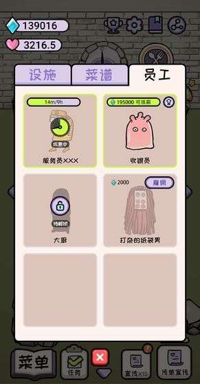 魔女后厨在这个游戏中,大家班演的是一个小小魔女的角色,她和她的小黑猫一起在完成模拟养成的任务,在这里可以从其手指引操作开始,不断的熟悉里面的场景,以及部分的区域如何去操作。游戏里的按钮设计都很齐全,所以大家可以不断的去尝试着开启它们的功能。这是一个女巫开的餐厅,所以一开始需要先把店内的一些基本设施解锁,几个比方说餐桌,椅子以及前台,有条件就可以雇佣服务员以及收银员等等。