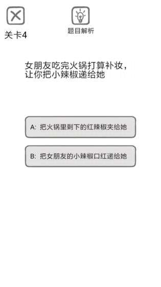 很不错的游戏主题,有助于各位直男朋友脱单。游戏以答题为主,但是有部分问题本质相同,算美中不足啦,还有就是通关结束语,太单调了啦,可以多一些趣味性的内容[比如按错误的次数给不同惩罚,比如跪键盘搓衣板榴莲什么的],游戏内容有点少,玩家很快就通关了的说,总之四星给内容,留一颗星给期待。PS:感觉写这篇写的有点短?G...最后最后希望策划大大可以出一个女版的,可以给我家那只玩一玩,让她感受直男的恐怖。
