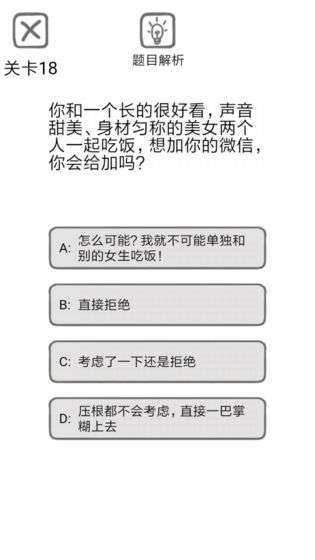 这是一款非常有意思的问答游戏,问题涵盖了当前非常广泛的各种“送命”题目,对于很多问题的答案,可能并没有标准,但是提供了一个思路,当你真正遇到这样的问题时,才能从容应对,给出对方满意的答复。游戏的玩法也很简单,回答预设的一系列问题,答对即可进行下一题,答错则“送命”,看谁能答对尽可能多大题目。