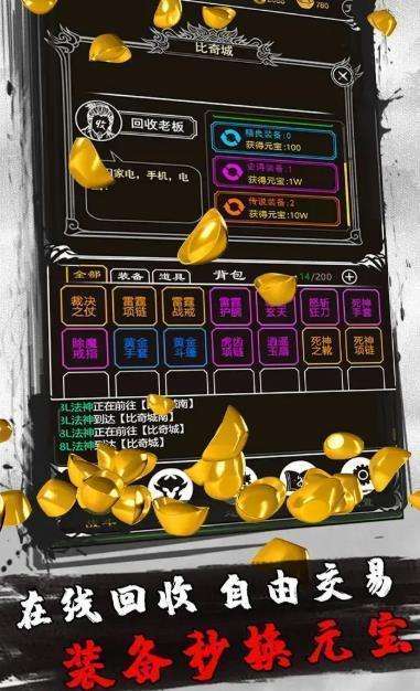 4、赤月风霜文字版传奇破解版装备全天回收,越好的装备换取的报酬就越多哦!