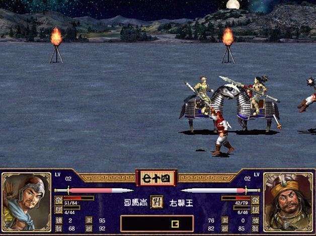 战斗模式:在大地图模式下,两个所属不同国家的兵团相遇,或一方的兵团进入另一方的城市时,就会进入战斗模式。交战双方的人马会同时出现在屏幕两边,交战规则采用淘汰制,每次各派一名将领出战。胜利的武将可再次出战。