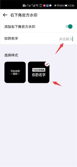 6、在“选择样式”中选择“你的名字”并手动输入即可自定义水印。