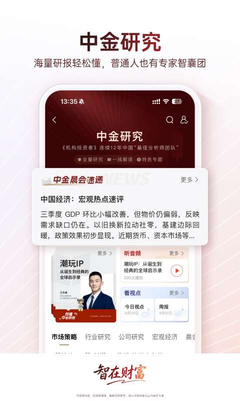 2、专业投资研究赋能:我们每天提供中金研究院的独家战略报告、深入的行业分析和宏观解读,提前抓住投资机会。