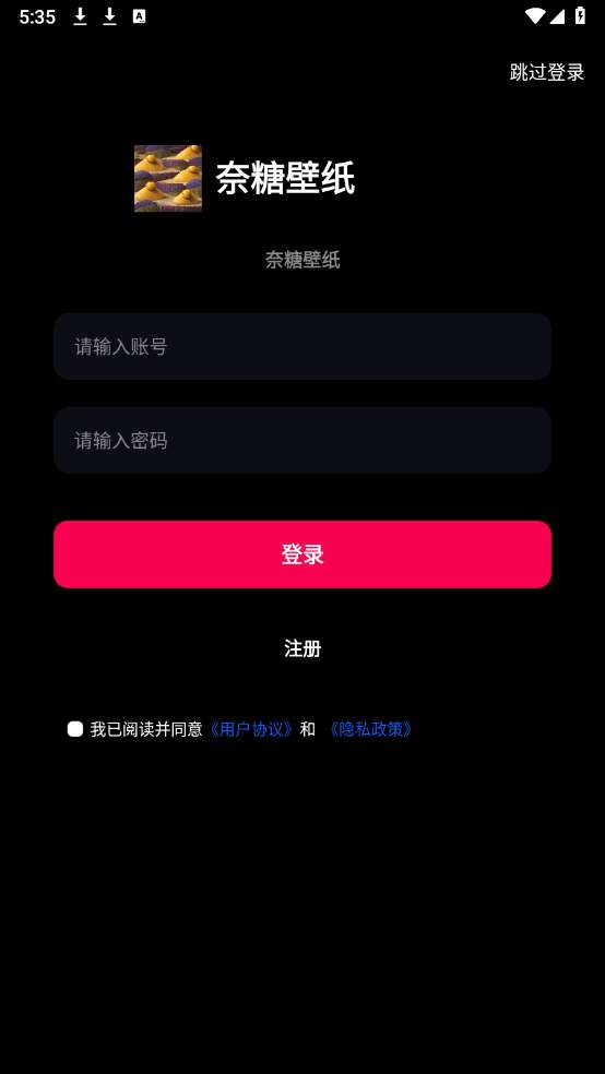 1、打开在本站下载安装的奈糖壁纸app,不想注册登录的用户可以点击界面右上角的“跳过”。
