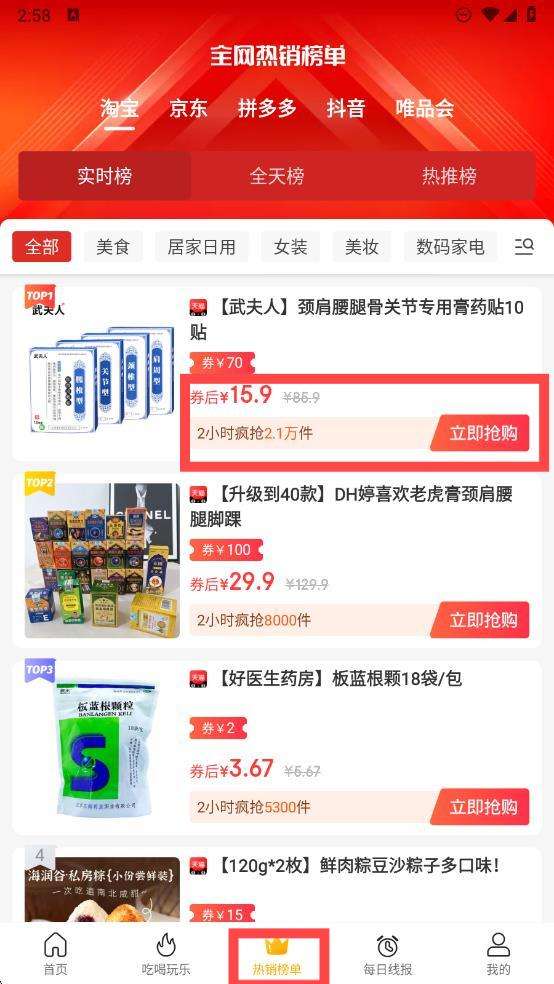 2、点击下方中间按钮,进入热销榜单界面,这里可以看见五大热门平台的优惠商品,可直接抢购。