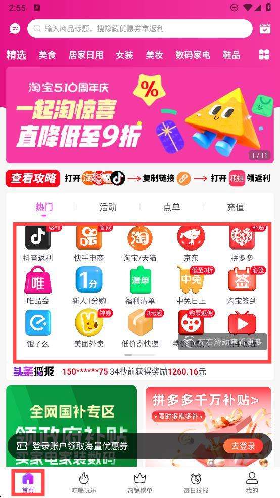 1、进入app后点击首页,可以看见各种平台的返利优惠,可根据自身需求进行选择。