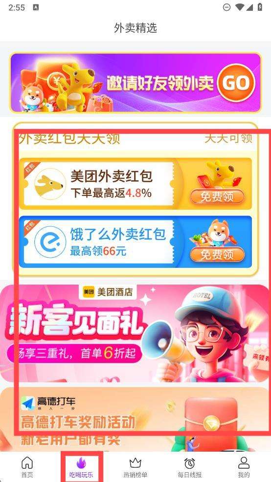3、点击吃喝玩乐按钮,这里可以选择外卖平台优惠券领取,以及酒店打车等优惠可参与。