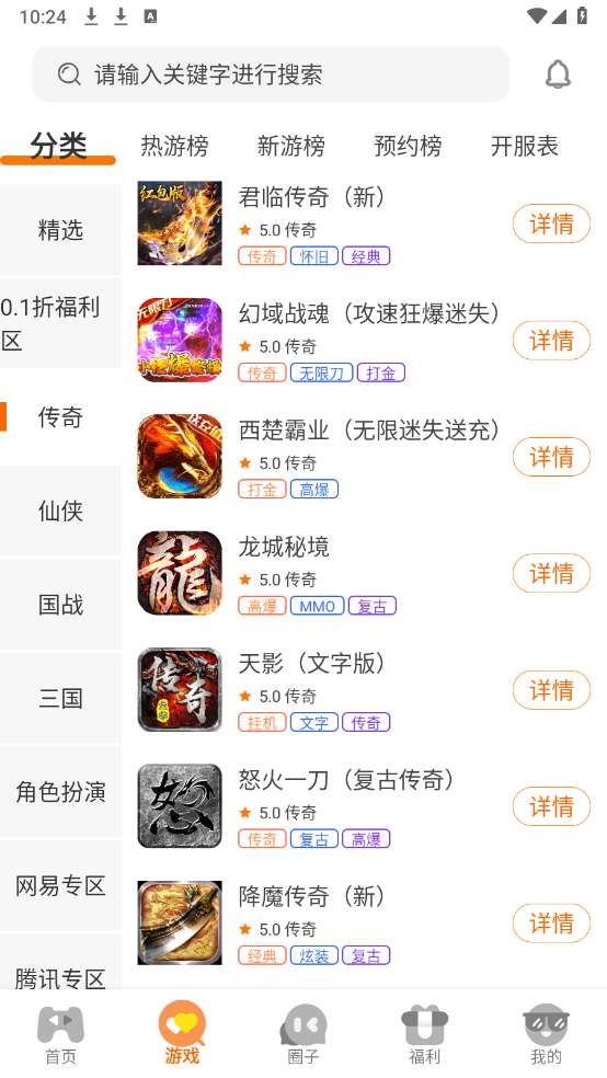 2、进入首页以及游戏页面,为玩家提供了海量的热门游戏资源,三国、传奇以及仙侠等都有。