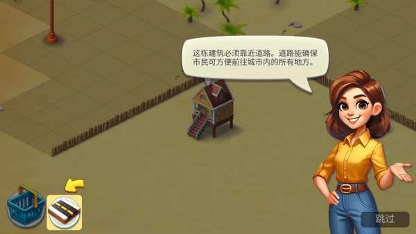 每一个建筑物都需要道路连接的点击左下角的这个图标。