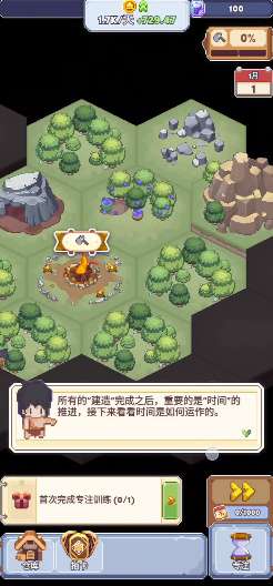 2、建造建筑:玩家可以在空地上通过点击选择建造不同建筑。游戏初期,玩家只能建造洞穴,但随着游戏的发展,可以解锁更多建筑。建筑的建造需要玩家进行资源管理,包括木材、石头等资源的收集和使用。