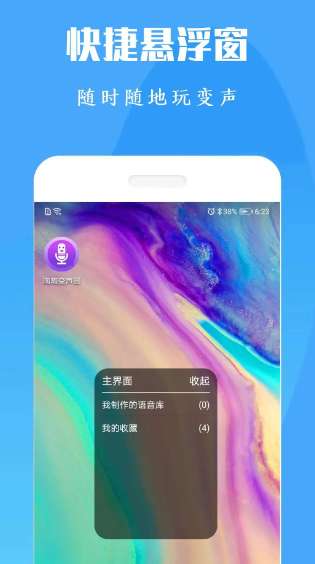 2、【悬浮窗变声】 开启悬浮窗,点击悬浮窗中录制和收藏的音效,即可自动倒计时播放变声后的声音,打开游戏麦克风,即可和队友畅聊,助你畅玩游戏!