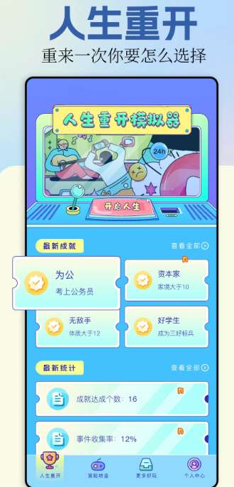 2、当用户进行重新开始生活的模拟时,软件会统计用户的成就,方便用户查看。