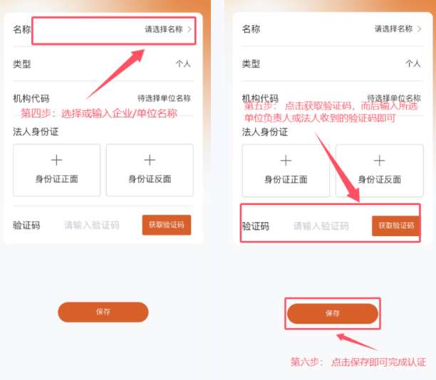 4、选择或输入企业/单位名称,点击获取验证码,而后输入所选单位负责人或法人收到的验证码即可,点击保存即可完成认证。