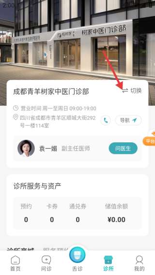 2、在诊所页,点击【切换】按钮,可更换显示的诊所信息。