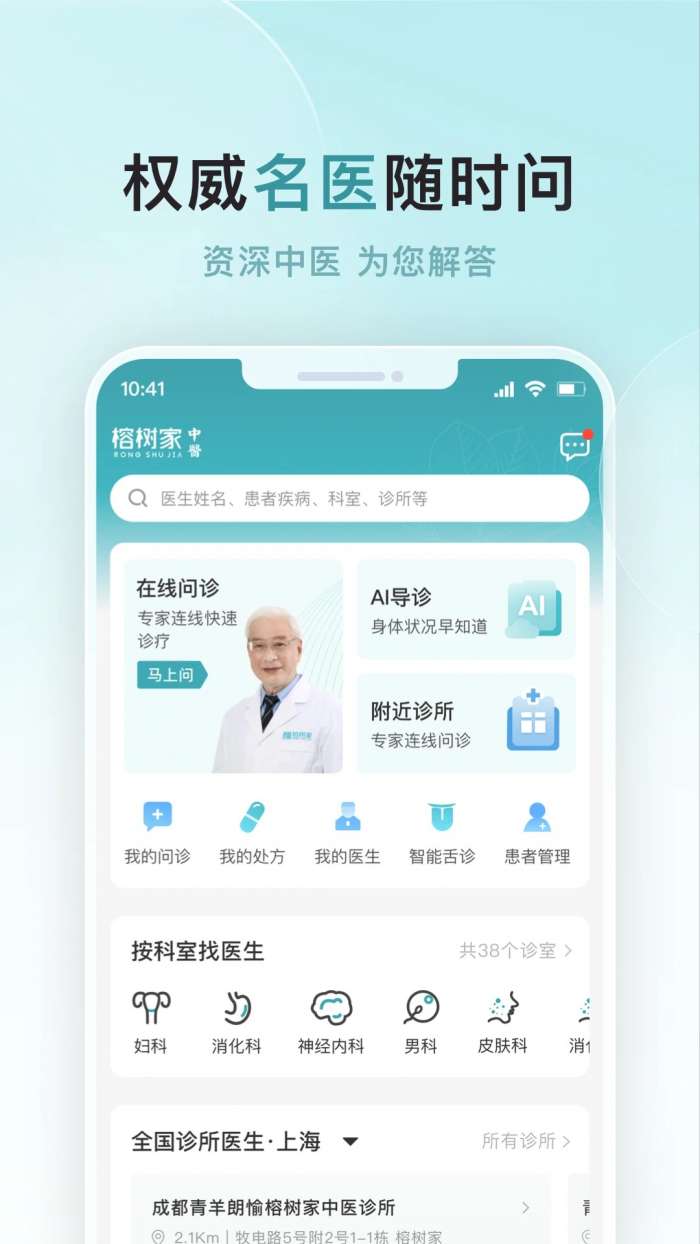 榕树家中医是一款受欢迎的中医治疗养生软件,拥有全新的首页设计,用户可以在里面找到各种知名中医专家,随时随地在线咨询各种健康问题,还提供丰富的门诊预约功能,允许用户免费预约医生,轻松关爱健康生活,能完全满足所有使用需求,还提供多样化的健康资讯,新闻动态等信息可以实时更新,方便用户自由浏览观看,轻松享受优质的健康诊断服务,还具有个性化的问诊专区,用户可以自由了解查看各种健康数据。