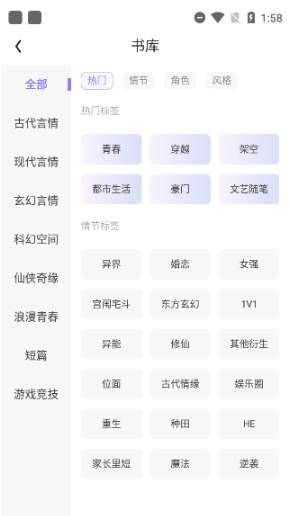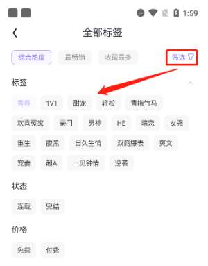 3、例如选择“青春”题材的小说,点击右方筛选还可添加如“1v1”、“甜宠”或“轻松”等更多的标签以更准确的定位