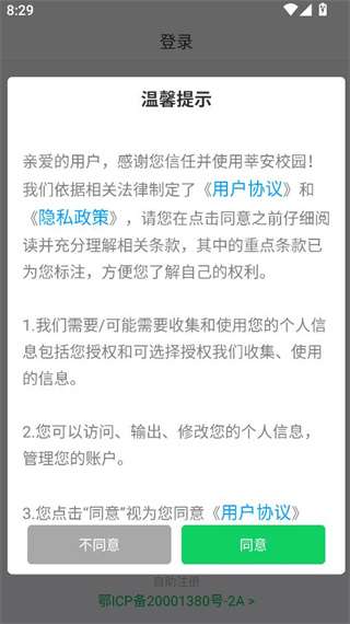 1、广大用户都能在手机上下载安装莘安校园app,阅读温馨提示后点同意。