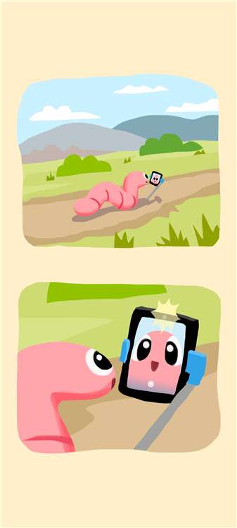 6、跳跃到目标区域,调整视角让蠕虫与场景物品同框,等待屏幕出现自拍提示,点击拍摄按钮,选择滤镜,确认保存,完成本关核心目标。