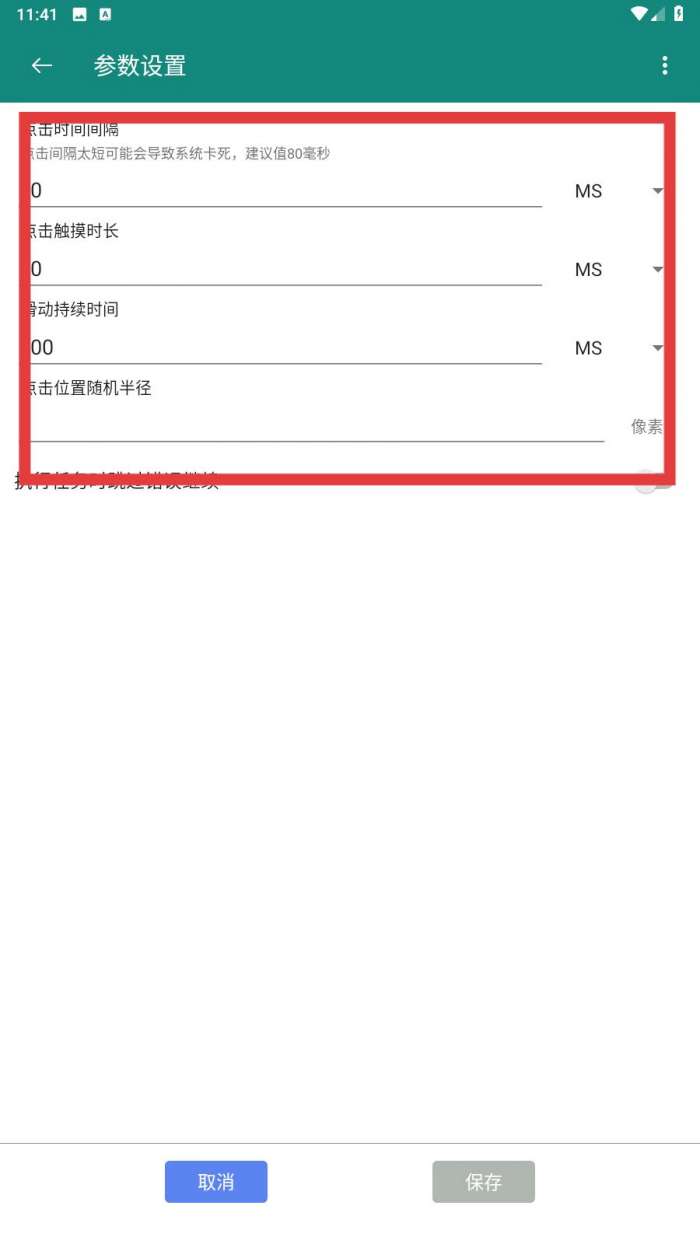 3、支持设置点击以及滑动操作的开始延迟,触摸时长,重复次数,每两次重复的时间间隔等。