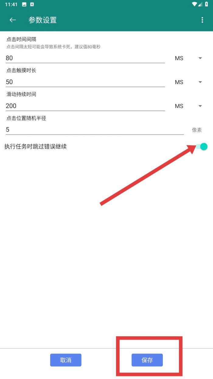 2、在参数设置页面,依次对点击时间间隔等参数进行设置,并根据需求开启执行任务时跳过错误继续功能。