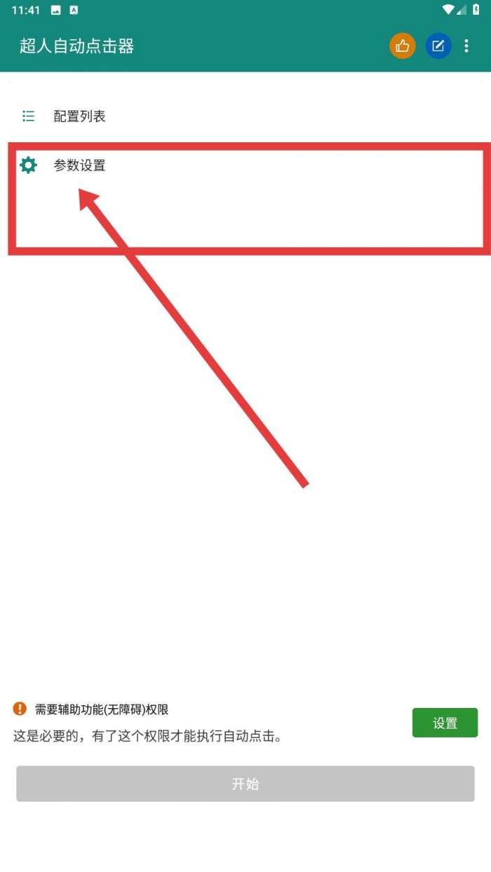 1、打开超人自动点击器应用,在配置列表页面,点击参数设置选项,进入参数配置界面。
