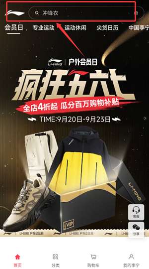 2、返回首页后,在顶部搜索栏输入冲锋衣,查找相关商品信息。