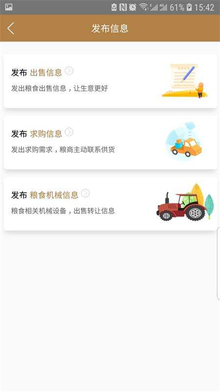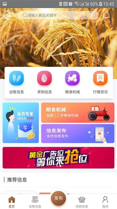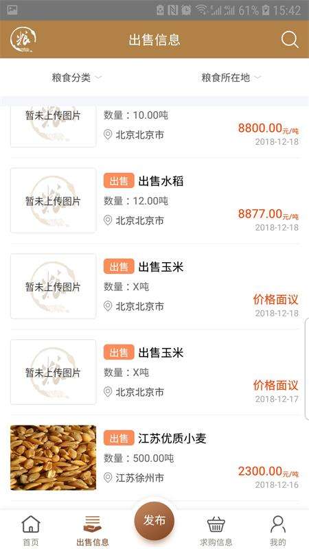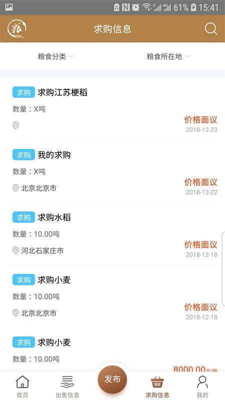 粮农家通用版是一款非常好用的手机两市交易服务软件都是网友,通过该软件都能够随时在线了解当下行情信息,以便网友及时抓住商机卖出一个较好的价格,另外出售信息和求购信息都有一个特定的栏目,用户直销,点击这两个模块就可以进行相关业务的查询。