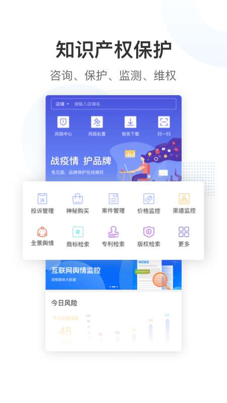 1、高效的进行数据对比来进行检测各种知识产权风险监测的服务,帮助能够大幅度的去提升数据维护以及知识产权维护