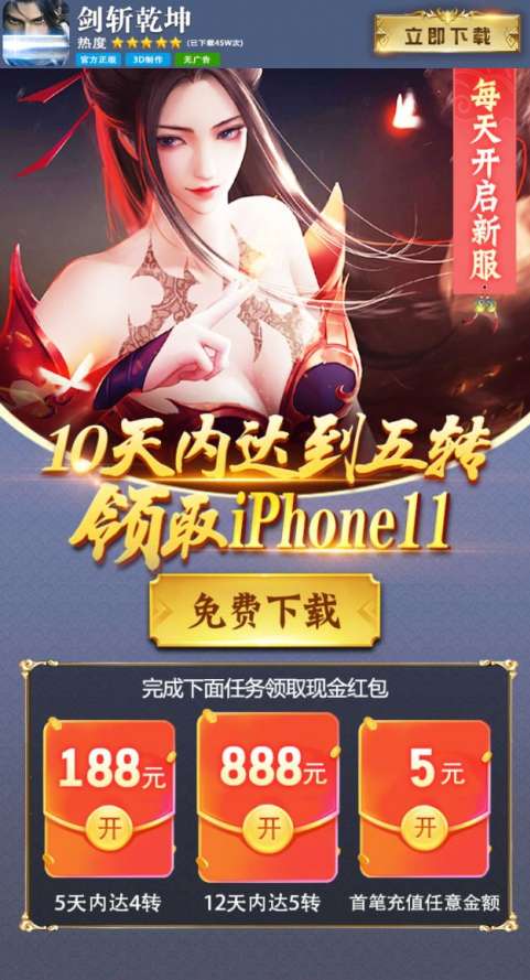 剑斩乾坤抖音版红包版是一款为仙友们带来了丰厚的红包升级就可以领取的仙侠游戏,在抖音上拥有极高的人气,而且在这里升至满级还能领取上千红包。新人玩家创号上线每天畅玩10天内天保证可以让你完成五转,然后领取大量红包,赶紧来下载看看吧!