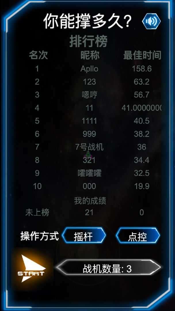 你能撑多久是一款非常好玩的动作射击手机游戏。在游戏中,玩家需要控制飞机躲避敌机的攻击,并尽可能多地摧毁它们。你能撑多久游戏内容丰富,非常考验玩家的反应和操作。玩家存活的时间越长,分数越高,奖励也越好。赶紧让朋友下载试试吧。