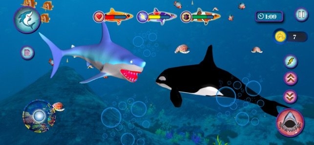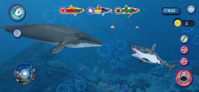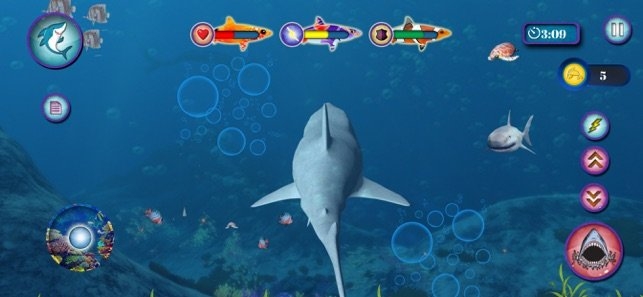 3、鲨鱼升级可以解锁各种技能,不同种类的鲨鱼拥有的技能各不相同技能,足以帮助你应付各种情况。