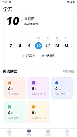 4、进入到学习的页面中可以进行打卡,查看阅读数据。