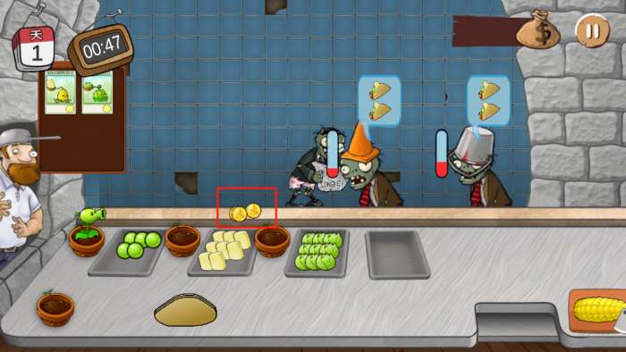 5、每一个僵尸都有一个耐心值,在耐心消耗完之前把沙威玛给僵尸就可以获得金币。