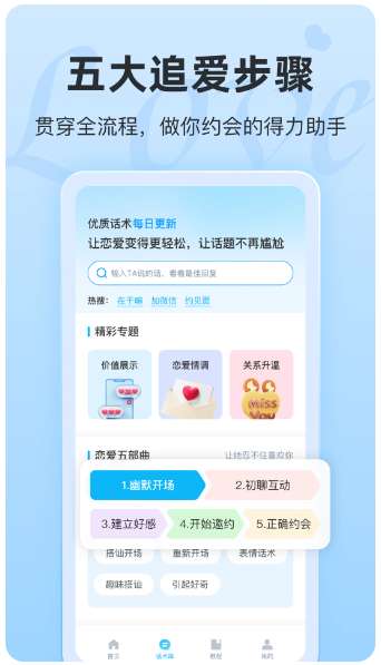 4、话题诀窍 提供聊天话题和技巧,并为用户提供全方位的支持和指导,包括情感咨询、恋爱心理学等知识,帮助用户更好地了解和应对恋爱中的各种问题。