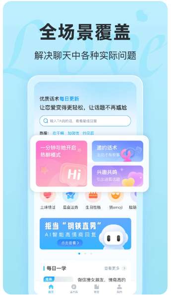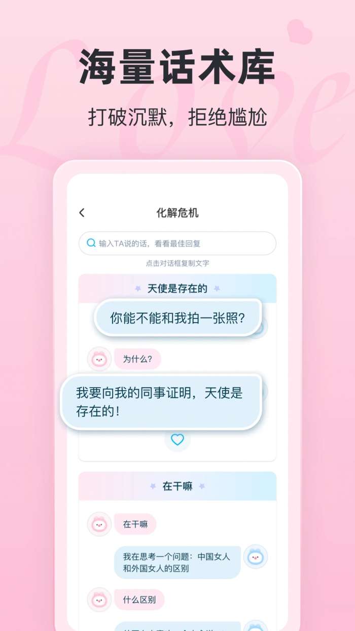 1、表达方式 拥有海量的聊天话题库,涵盖各种恋爱场景和情感表达,用户可以根据需要选择合适的话题进行聊天。