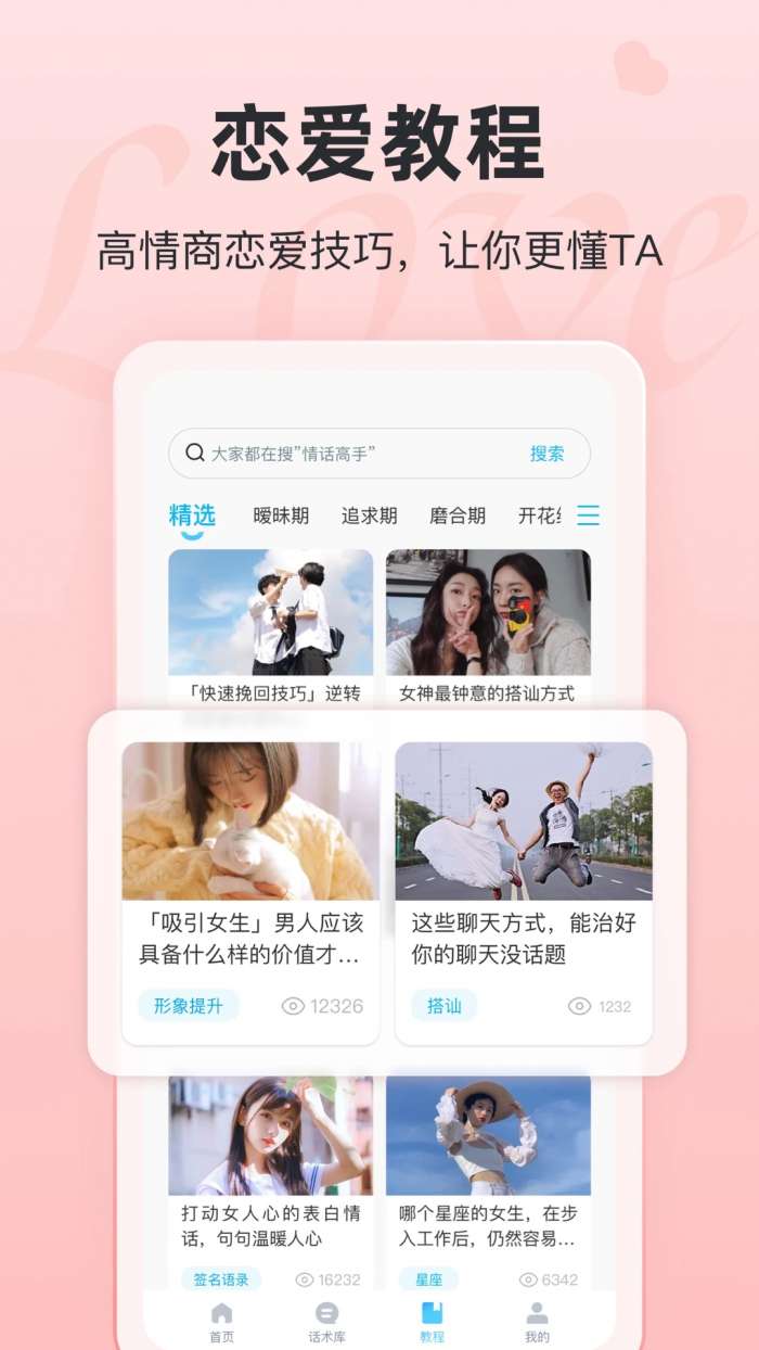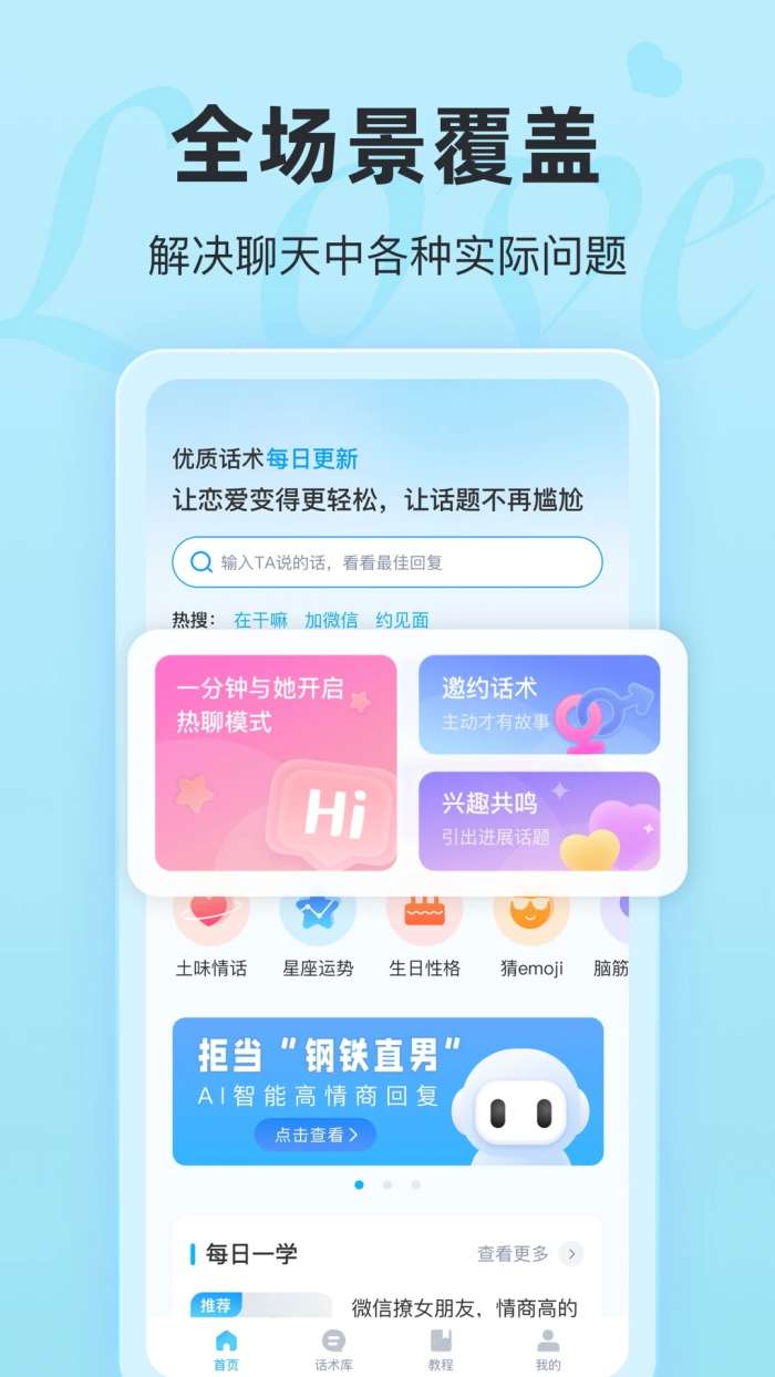 恋话宝是一款专门为恋爱初学者和有恋爱困惑的人群打造的恋爱聊天话术应用,适合自己的爱情教程学习资源汇聚于此。恋话宝app内置独特的恋爱土味情话资料文章资源,可以快速准确地解决各种有趣简单的聊天问题,让您可以使用更多简单的工具体验。恋话宝app具有话术的恋爱教程更新课程特别丰富,可以让你学习各种各样的恋爱聊天情商。提供丰富的聊天话题和实用的聊天技巧,帮助用户在恋爱中更加自信流畅地表达自己的感情。
