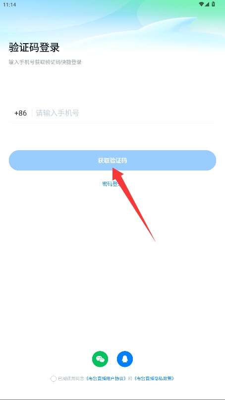 2、进入登录界面,输入手机号码,勾选同意协议后点击获取验证码并输入登录。