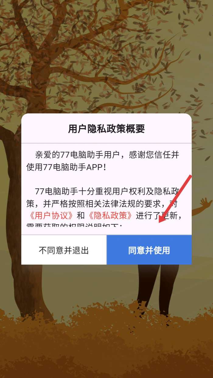 1、使用77电脑助手app,需先在用户隐私政策概要弹窗点击同意并使用,接受相关协议才能继续。