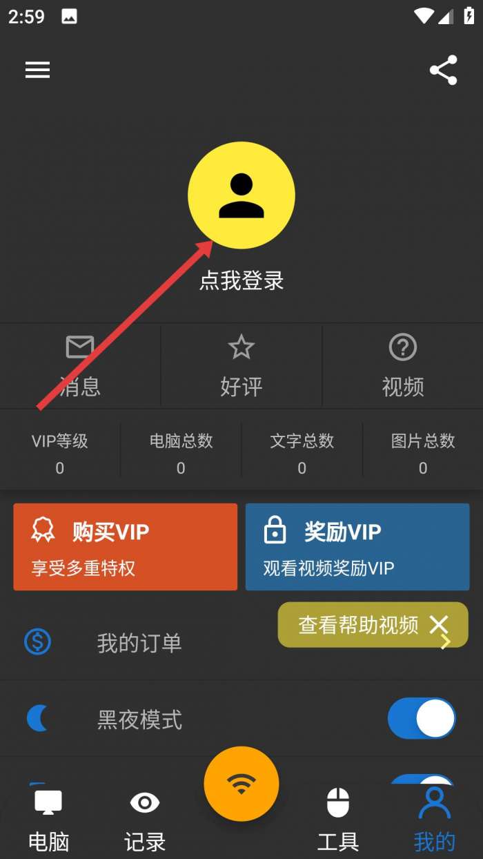 3、在我的界面,点击点我登录可进行账号登录操作,还能看到购买VIP、奖励VIP等功能选项,以及查看消息、好评、视频等内容。