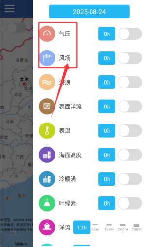 4、在图层设置中可添加气压分布与风场动态的专业气象数据展示。