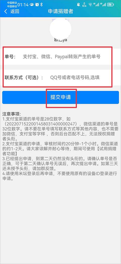 6、然后将转账产生的单号和联系方式填写完成后点击提交申请即可。