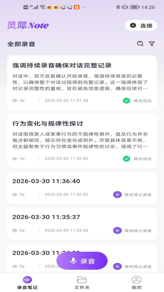 灵犀 Note是一款专注于蓝牙录音和智能音频分析的实用工具 app,专为日常录音、会议组织、学习复习等多种场景设计。无论是害怕在课堂上错过老师的重点,没有足够的时间在会议期间手写会议记录,还是希望在与朋友聊天或采访时完整保留对话内容,或者希望快速将语音备忘录转换为可编辑的文本,都可以轻松应对。操作简单,连接稳定,数据安全,帮你免去手动录音的烦恼,轻松应对录音和文字处理。它是您高效、无忧的便携式录音助手。