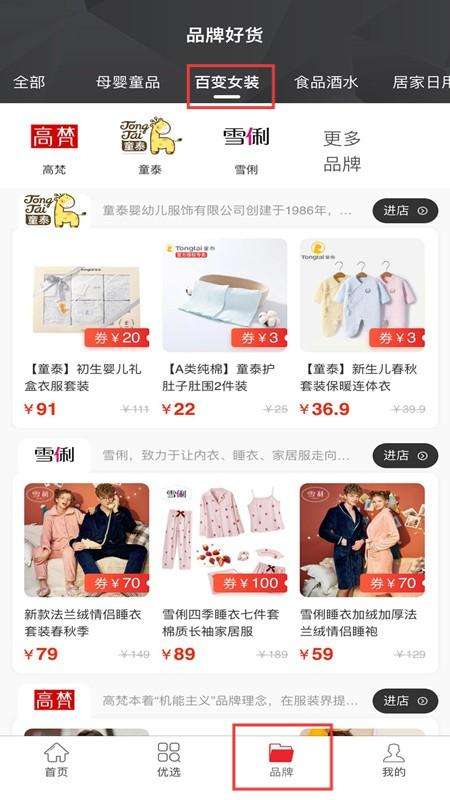 2、可按分类查找商品,如点击百变女装分类,查看高梵、童泰、雪俐等品牌的女装相关优惠商品。