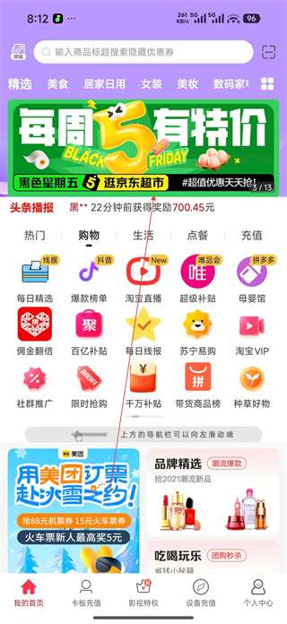 1、打开软件进入主页,浏览各类板块入口,查看每周5特价等活动信息。