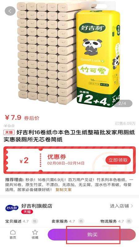 3、可查看其券后价等信息,若想购买,点击底部购买按钮即可跳转至对应电商平台下单。