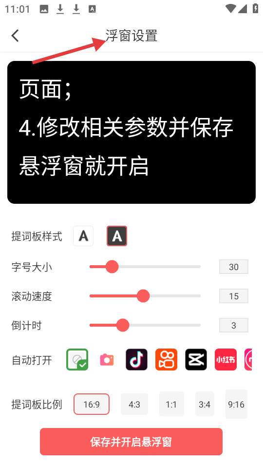 4、浮窗设置页参数调节丰富,从提词板样式到自动打开应用都能设置,修改后点击保存即可开启悬浮窗定制专属体验。