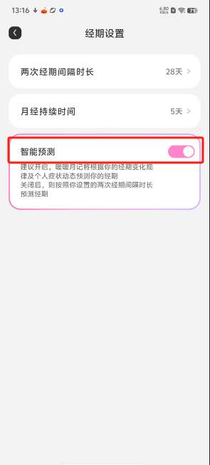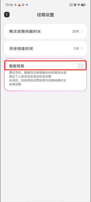 3、点击“经期设置”,找到页面上“智能预测”后面的白色圆形滑块。