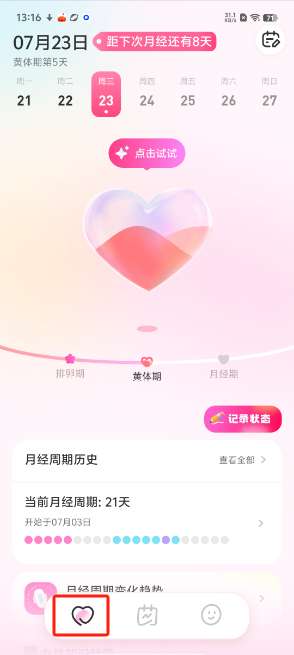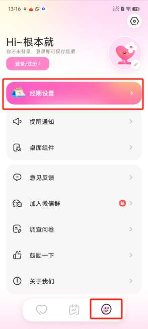2、点击底部右下角的图标,找到页面上的“经期设置”。