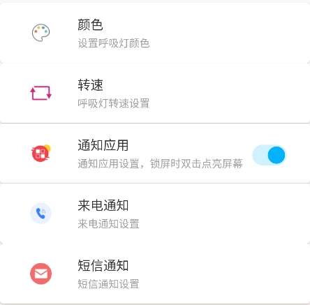 3、可以对吸灯的颜色、转速、通知应用程序、来电和短信进行单独设置。