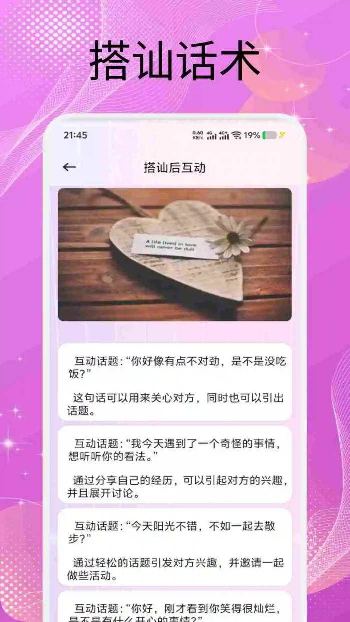 免费情话软件大全想要和自己的心选发展感情吗?想要在聊天的时候哄自己对象开心吗?今天小编就为大家带来这个免费情话软件大全,对于不会聊天,不知道怎么挑起话题的用户来说这里的软件能够帮助你和自己心爱的人交流不断,在聊天以及互动的过程中让两个人的感情不断的升温,当然这里的软件还有非常不错的互动匹配功能,你可以随时通过平台参与不同的社交活动,你可以在这里遇到很多有趣的人,在网上轻松互动直到和自己的那个TA相遇。